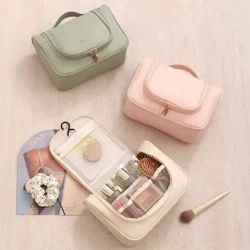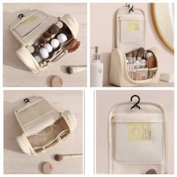Neceser plegable con compartimentos de malla y un gancho para colgar, ideal para viajes y optimizar el espacio en el baño y también es portátil con asa de mano, perfecto para llevar cosméticos o artículos de cuidado personal de forma organizada. Están diseñados para mantener los artículos de higiene y belleza ordenados y protegidos, especialmente durante viajes.