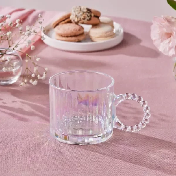 Disfruta de tus momentos de té con estilo y sofisticación con esta taza de vidrio de alta calidad. Su diseño único y elegante, con detalles en relieve y un asa distintiva, las convierte en la pieza perfecta para tus reuniones y celebraciones. Cada taza presenta un diseño original con detalles tornasolados en relieve que añaden un toque de distinción y elegancia. El asa, con un diseño único y atractivo, facilita el agarre y realza la belleza de cada taza.